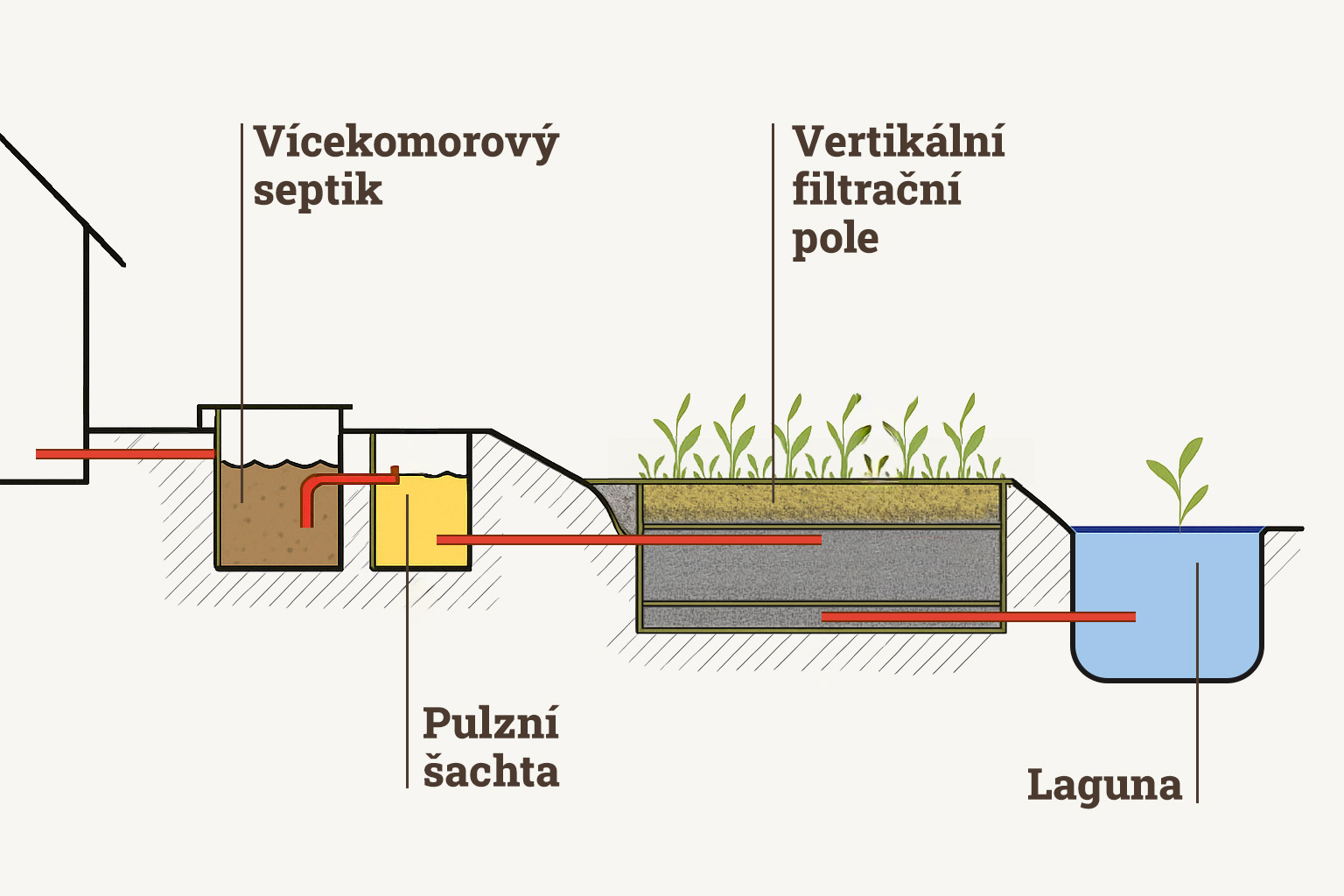 Veškerou odpadní vodu svedeme do speciálního vícekomorového septiku, kde sedimentačním procesem zadržíme většinou pevných částic. Ze septiku voda volně přepadá do další speciálně vystrojené šachty, kde se odpadní vody akumulují a po dosažení určité úrovně jsou tzv. pulzem vypuštěny do další části systému, kde proběhne druhá fáze čištění (opět bez jakékoliv nároku na elektrickou energii).